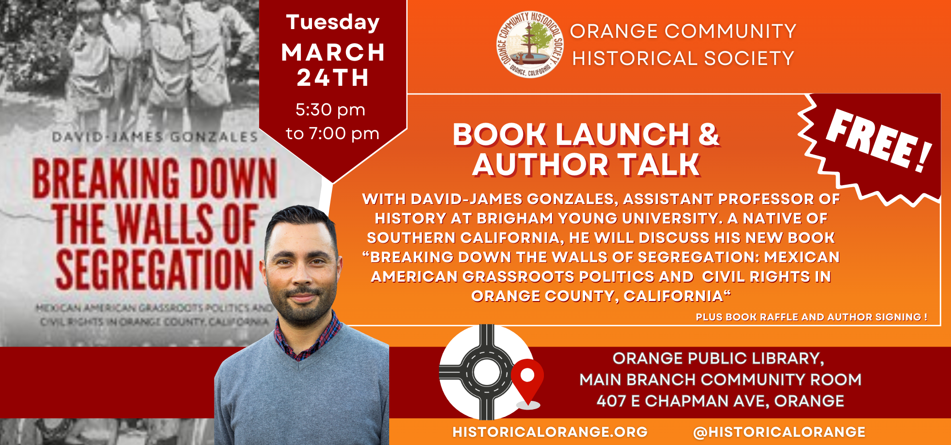 During this FREE community program hear David-James Gonzales, Assistant Professor of History at Brigham Young University and a native of Southern California, as he discusses his new book “Breaking Down the Walls of Segregation: Mexican American Grassroots Politics and Civil Rights in Orange County, California“.